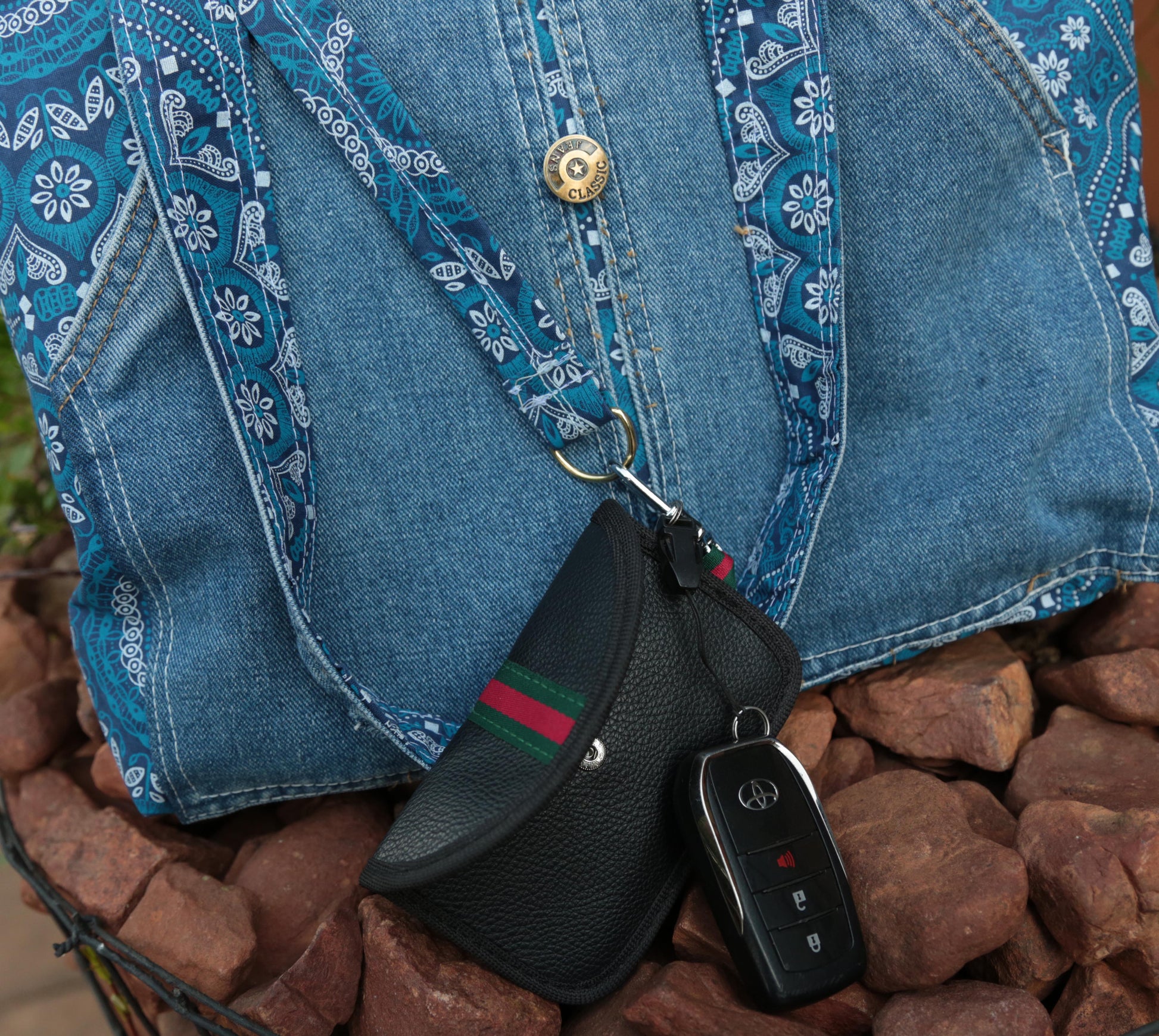 Showcasing a distinctive Shweshwe design, it includes two outer pockets roomy enough for two glasses or a bottle of wine. The built-in key buddy ensures your key fob is always within reach.